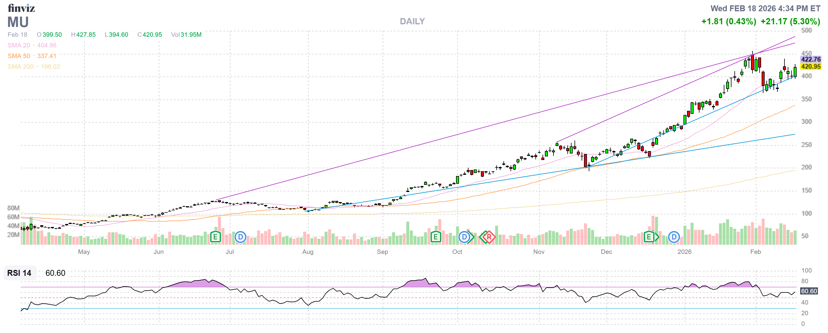 The Rebound: We saw a massive recovery in the “Builders.” Nvidia (NVDA) rose 1.6% on news of a strategic partnership with Meta, and Micron (MU) surged 5.3% as memory pricing power becomes the new oil.