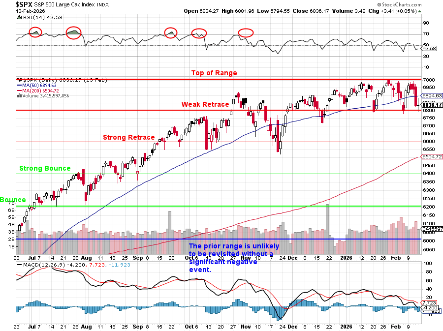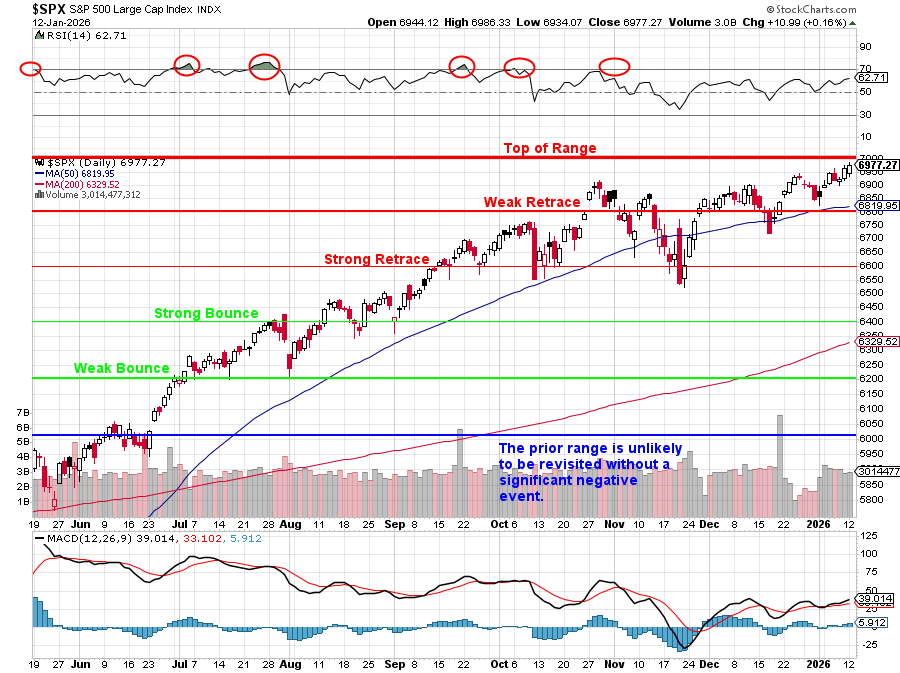 "Last month, the S&P 500 was at 6,800 on the nose and, since our Dec 17th Review, we are up 177 points (2.6%) – just 23 points from 7,000 which is, unfortunately, the top of our predicted range for the S&P 500 for 2025 and, so far, we have not seen any good reasons to raise our levels for 2026. Of course, Q1 earnings start this week so maybe they’ll be better than we expect and also – there’s nothing unusual about overshooting the range by a segment (200 points in this case) or even two – so we could keep going – but a retrace is more likely. "