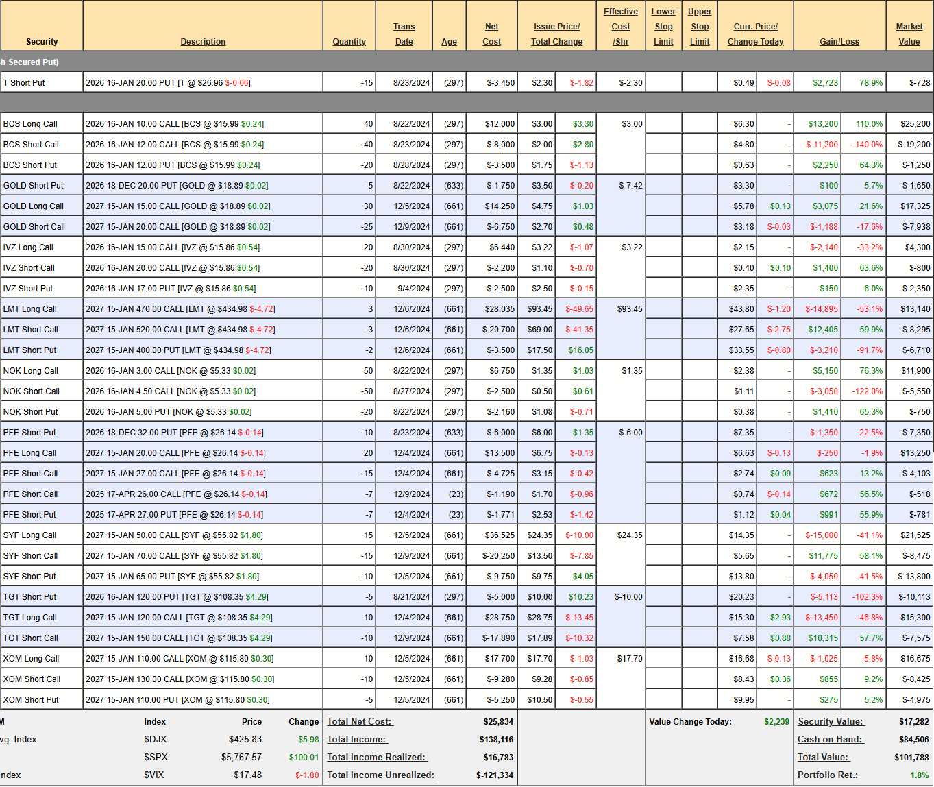 Fortunately, the portfolio held up and we have $84,506 in CASH!!! to deploy but first – we see if we want to make adjustments to our current positions (we do!):