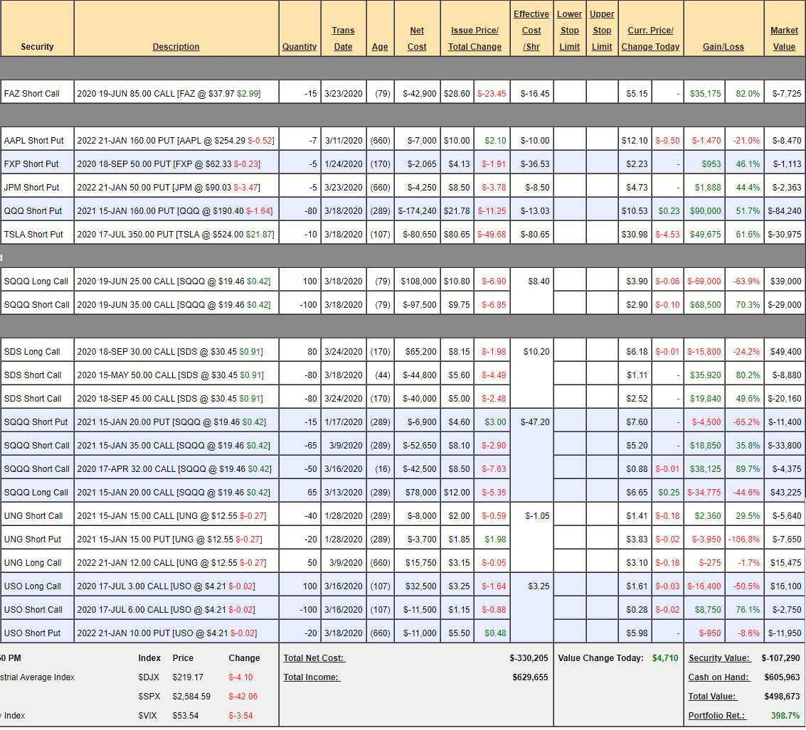 Because we hedged, our Short-Term Portfolio (STP) is up 398.7% for the year as of yesterday's close and it's important to step back and look at our hedges and determine whether or not we are adequately covered in case Team Trump continues to bungle their way into 1M deaths – which is way past my 50,000-200,000 predicted range.  With 189,633 US cases as of this morning and about 3,000 deaths (they don't give US totals) and only 7,136 recoveries – things are getting worse and worse but we already expected that – so it shouldn't drastically change our market outlook – yet: