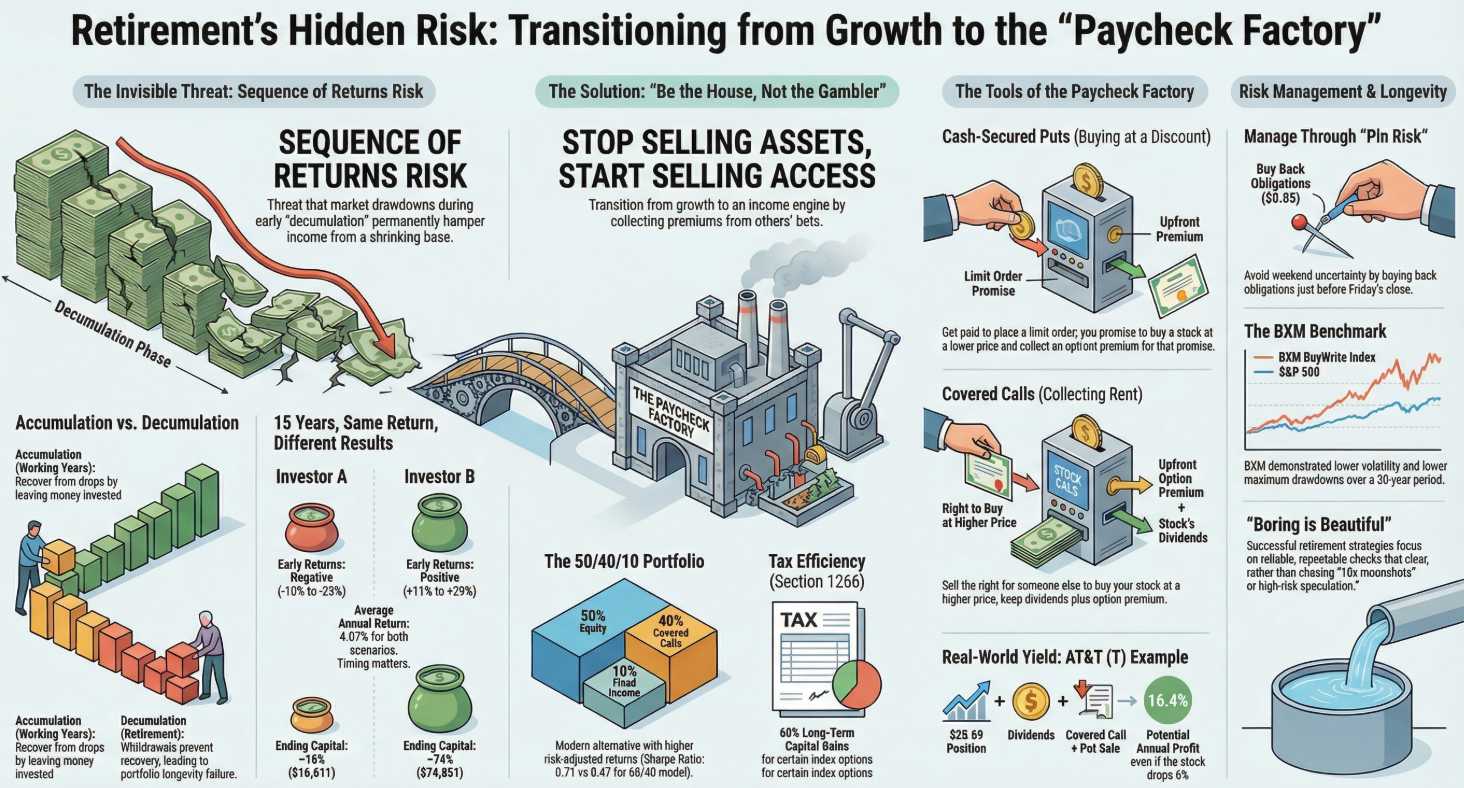 You are not “bad at investing,” you’re just running the wrong machine. A retirement portfolio isn’t a growth portfolio anymore; it’s a paycheck factory. Most people are trying to manufacture paychecks by sawing pieces off the factory.