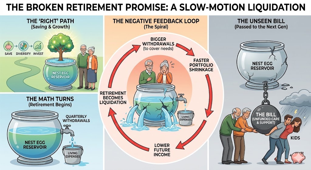 They did “everything right” – saved, diversified, stayed invested – and now the math is turning on them. Every quarter the withdrawals get a little harder, the portfolio gets a little smaller, and the income gets a little thinner. That forces bigger withdrawals, which shrinks the portfolio faster, which lowers future income and, suddenly “retirement” starts to look like a slow-motion liquidation.