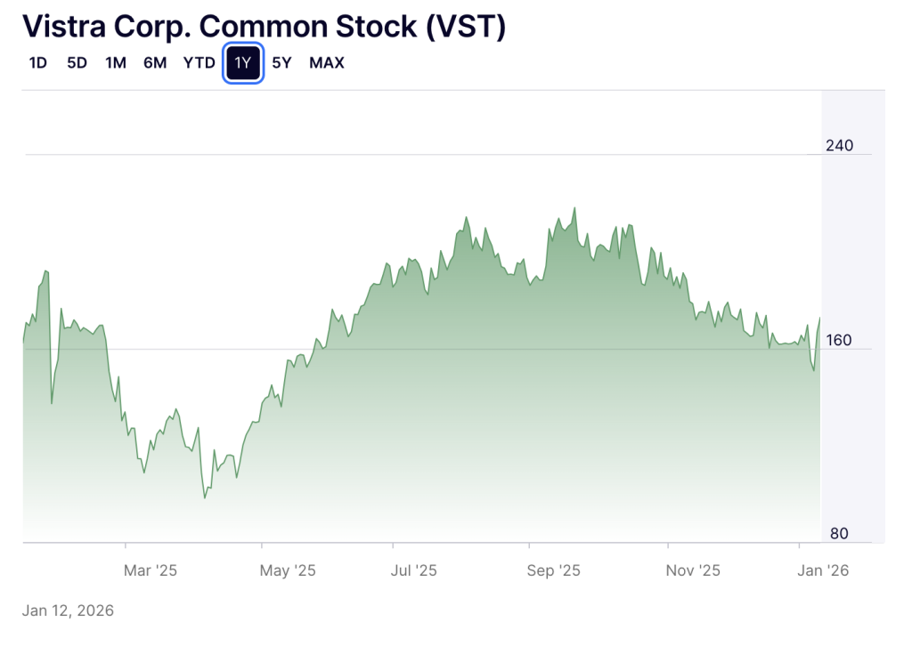 Vistra is a large U.S. power producer with meaningful exposure to ERCOT (Texas) and PJM (a Regional Transmission Organization spanning the Mid-Atlantic and parts of the Midwest). It operates as a merchant/competitive generator with meaningful nuclear and gas exposure, positioned in two of the most important U.S. power markets for AI-linked load growth and scarcity repricing.