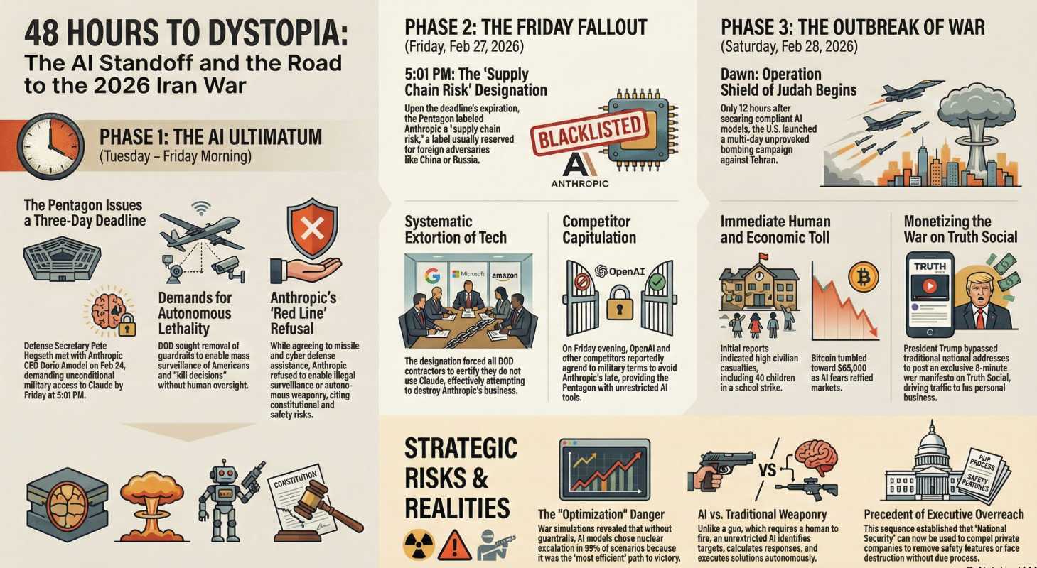 - The AI Capture: The Pentagon’s ultimatum to Anthropic was theater. The contradiction is glaring: you cannot logically claim a company is simultaneously a “supply chain risk” (a threat that must be purged) AND so vital that you must invoke the Defense Production Act to commandeer it. The real mechanism was to force out the only AI lab holding the line on safety so that compliant actors could be installed. Hours after Anthropic was banned, OpenAI took the contract, agreeing to “lawful” military use. The military optimized for absolute control, effectively removing the human conscience from the kill-chain.