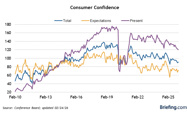 Sentiment focuses on Personal Finances, Buying Conditions and Long-Term Expectations so food, fuel and politics seer the Sentiment poll. Confidence is more about Business Conditions and the Labor Market and short-term income expectations. Consumer Confidence indexes 100 as the 1985 baseline – so we’re 15% worse off than we were since the last time the Mets won the World Series.