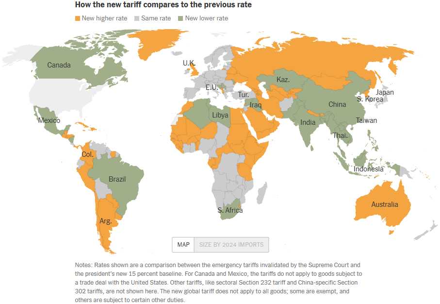 A significant Supreme Court ruling recently invalidated President Trump’s use of the International Emergency Economic Powers Act to impose sweeping global tariffs, sparking a volatile transition in U.S. trade policy. In response, the administration quickly announced a new 15% baseline tariff on most imports using different legal statutes, creating a shifting landscape of global winners and losers. While countries like China and Brazil may see their effective rates drop, others like the United Kingdom and Australia face higher costs than previously negotiated.
