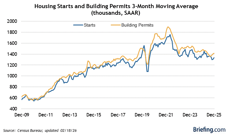 The Data: Housing Starts for December beat expectations at 1.404 million (vs 1.32M) and Permits beat at 1.448 million.