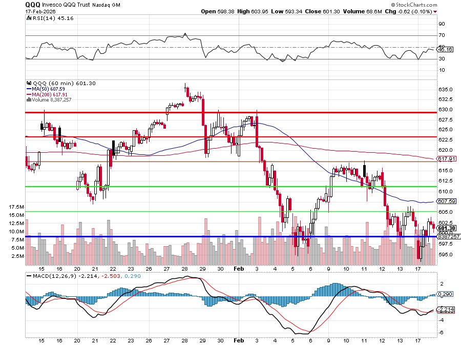The Bounce: Futures are up. Nasdaq +0.5%. We are seeing a “Dip Buyer” algorithm at Phil’s predicted 600 level on QQQ – triggered after the S&P held the 100-day moving average yesterday.