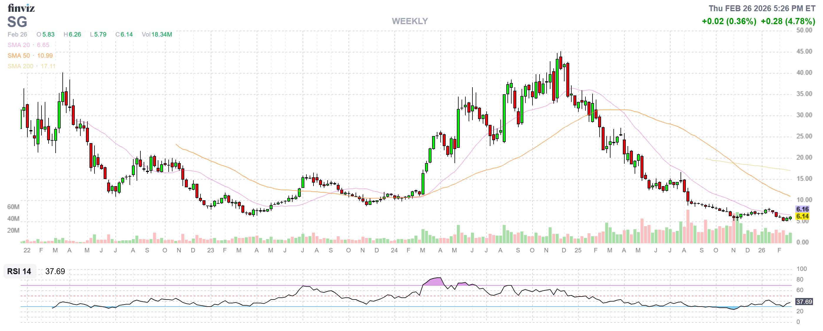 📚 Rowan: The most fascinating human and corporate tragedy today is playing out in the fast-casual restaurant space. Sweetgreen (SG) just reported that its comparable sales declined more than 11% in the fourth quarter, the worst since it went public. The company has squandered almost 80% of its market value.