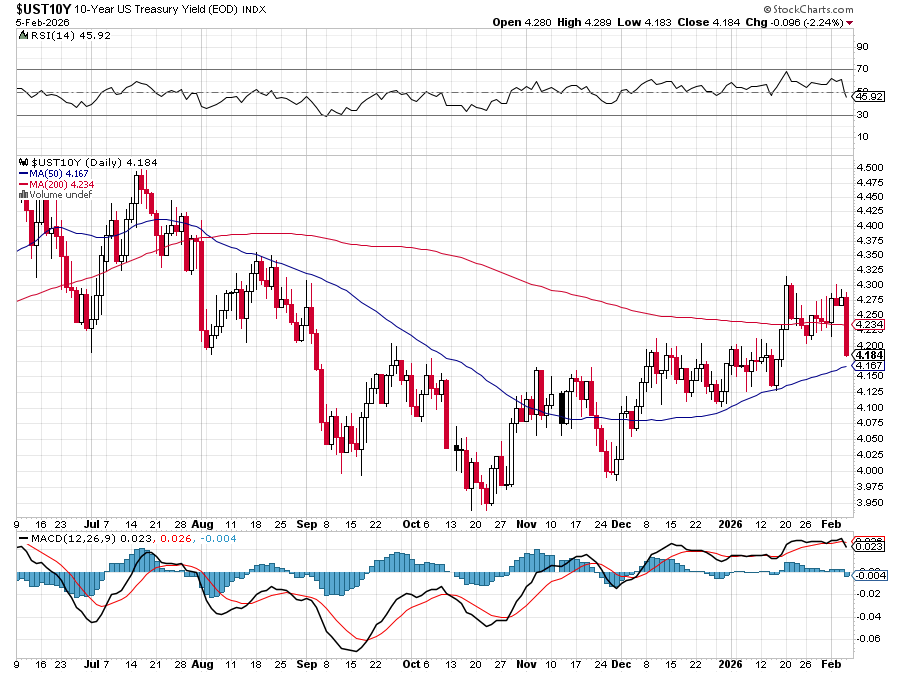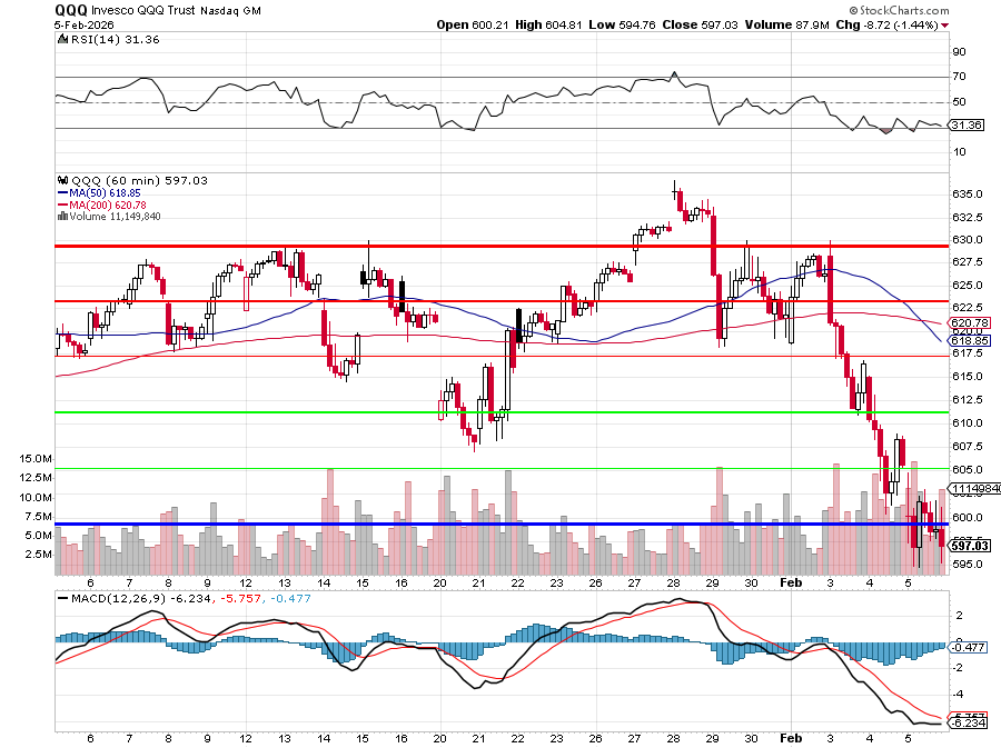We were at 617.99 on QQQ back on January 6th, when 600 looked so far away but here we are this morning, now 600.87 after a two-week, 5% tumble that was entirely expected. A key to the turnaround this morning is yesterday’s TERRIBLE Jobs Numbers with Unemployment Claims jumping 231,000 for the week while the JOLTS report hit a 5-year low (not since the last Trump term) with a stunning 109,000 job cuts in January. That brings back hopes that the Fed will lower rates to save the job market which, of course, made the 10-year fall back to 4.18% this morning – out of the danger zone: