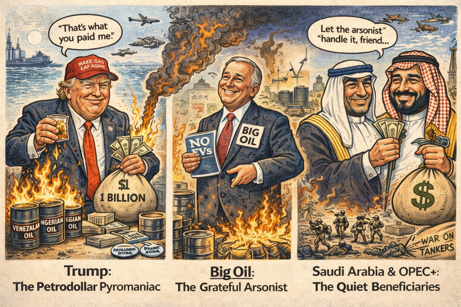 the President who literally asked Big Oil for a billion dollars is now simultaneously tightening the noose around two of the world’s largest swing oil suppliers while giving Saudi Arabia a warm press blackout. That isn’t strategy—it’s price support with air cover.