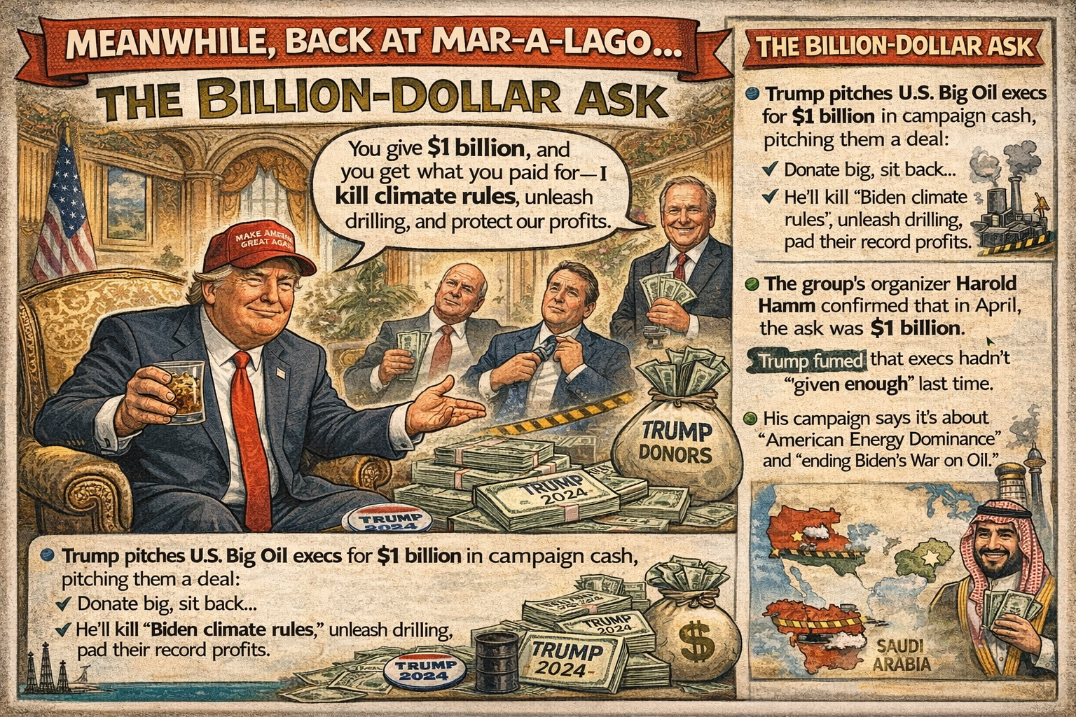 • In April, Trump sat down with oil executives at Mar‑a‑Lago and asked them for $1 billion in campaign cash, pitching it as a “deal”: you fund me, I kill climate rules, unleash drilling, and protect your profits. thehill