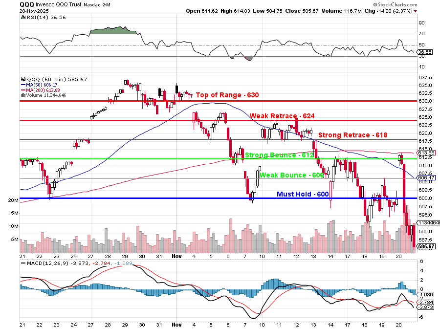 By Nov 1st we formalized it with the 5% Rule™ levels: 630 as the top of the range, 600 as the near-term bottom (for a 5% drop), 606/612 as weak/strong bounces off 600, and 618/624 as strong/weak retrace lines on the way back down. That gave us an objective framework to separate “noisy dip” from “real correction.”​