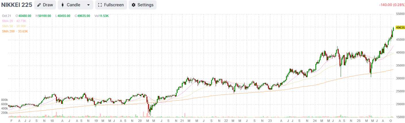 The Japanese stock market has demonstrated significant momentum, rapidly approaching the symbolically important 50,000 level.