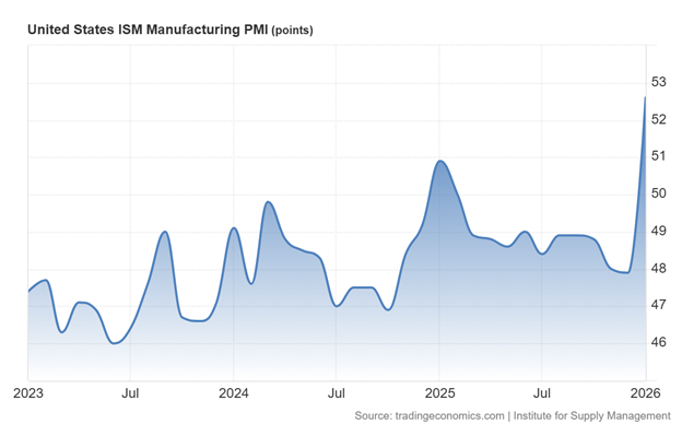 The reality today is that the economy remains remarkably strong. Employment data is resilient, labor force participation is near record levels, and corporate profits are breaking out to new all-time highs. Furthermore, the ISM Manufacturing PMI (Purchasing Managers Index) recently spiked to 52.6, signaling an expansion in a sector that had been declining for years (see chart below).