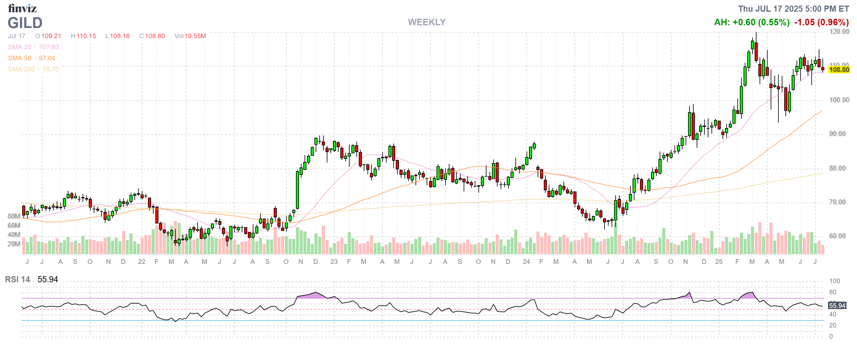 Puts are not worth selling (Oct $105 puts are $3.50), but of course on a nice dip sell some. As it stands, net $25,500 on the $45,000 spread but your time advantage means easily double that if things go well to the upside and, if not, then you have 2.5year to sell $5,500 per quarter ($45,000 ish) not even counting short-term puts and you WILL collect at least $8,000 more premium when the 2026 short calls expire (or position at worst) so lots and lots of ways to make money and, if GILD goes down, you sell short-term puts ($2,500+ per q) and more 2027 puts ($5,000) and you use that money ($5 per long) to roll down to the $80 calls and, if lower, roll and DD and make it a 5-year recovery play.