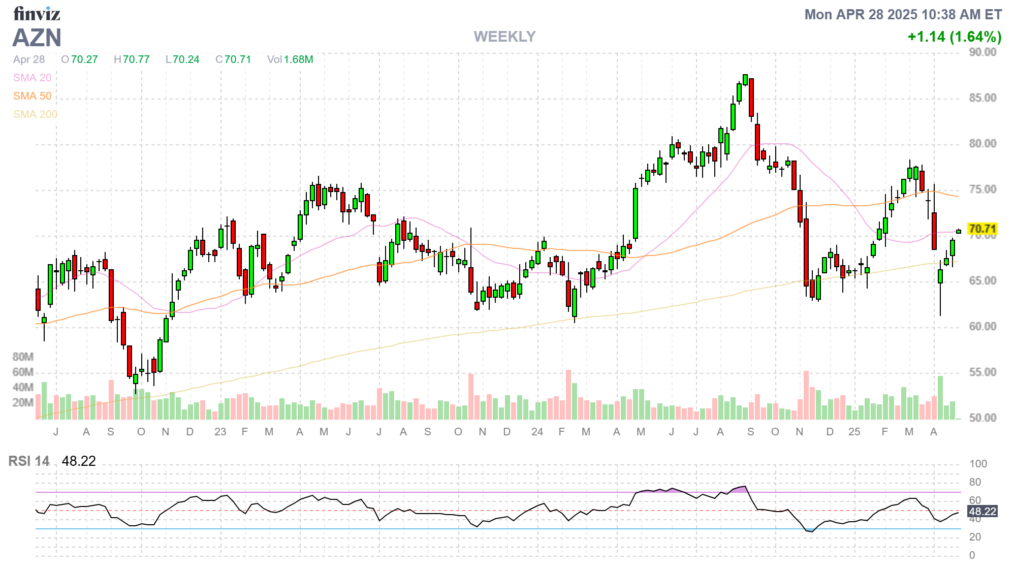 - Situation: A global biopharmaceutical giant, AZN has a strong ROC (87) and is currently 20.7% below its 52-week high.37
