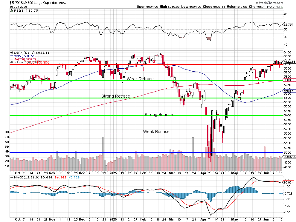 We were "comfortably" over the top of our range back in February, and then tariffs took us down 20% in a month and here we are again in June - just a bit lower than we were then but the RSI is higher (stressed) and the MACD is higher (stretched) so conditions are ripe for a huge fall once again and I'm glad we are now sitting in CASH!!! - just in case!