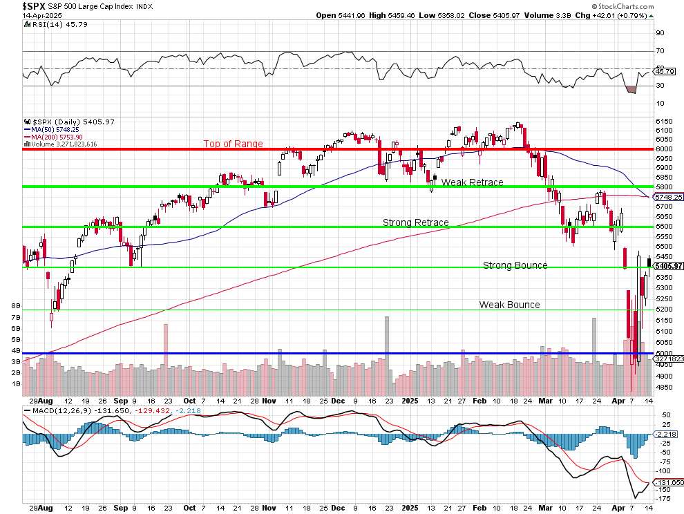 We are NOT out of the tariff woods yet - not by a long shot and overall, the S&P 500 is still 270 points (4.7%) below where we were last month (18th) and we're resting on our Strong Bounce Line but heading into a Death Cross that officially struck the S&P yesterday at 5,750 - 345 points above where we are now (5,405). With looming Tariffs (90 days), a Stagnant Economy, Inflation and uncertain Corporate Earnings - I can't say I'm enthusiastic about getting back to our highs: