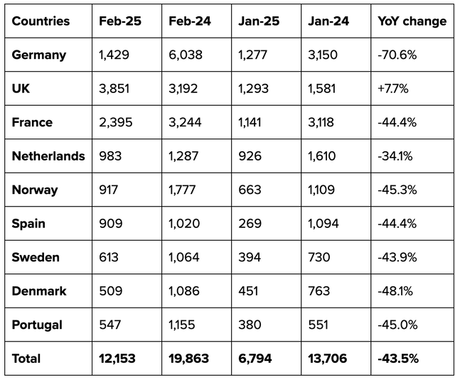 This is not sustainable for a company that saw its February vehicle sales decline by 76% in Germany, 49.2% in China, and 44.4% in France. TSLA delivered just 1,429 new cars in February in Germany, demoting the country one notch from its largest and most important European market. The pain is set to compound with a March survey of 100,000 Germans revealing that 94% would not consider purchasing a Tesla.