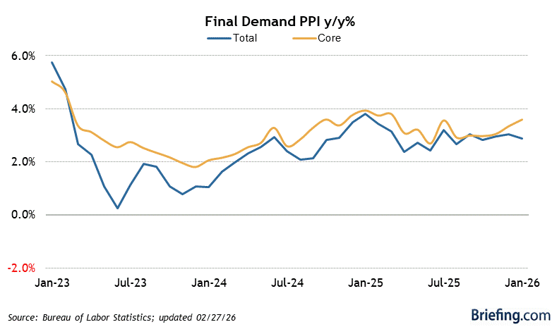 The immediate downward pressure on the futures this morning is driven by macroeconomic anxiety. Traders are stepping back ahead of the January wholesale inflation report (PPI), which is expected to show monthly increases of 0.3% (too hot!) for both core and total readings. Additionally, the Chicago PMI is due today and is forecast to retreat to 52.5 after a remarkably strong January (54.0).