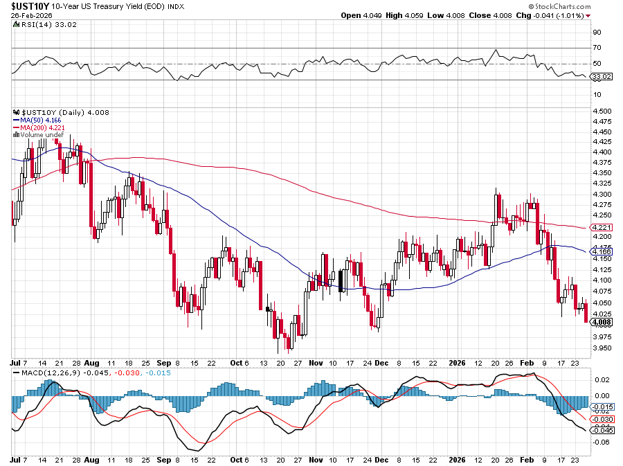 Because of this uncertainty, combined with lingering fears over the “AI scare trade,” we are seeing a rotation away from US equities. The 10-year Treasury yield has slipped below 4% to 3.99%, which is acting as a haven for capital fleeing the stock market.